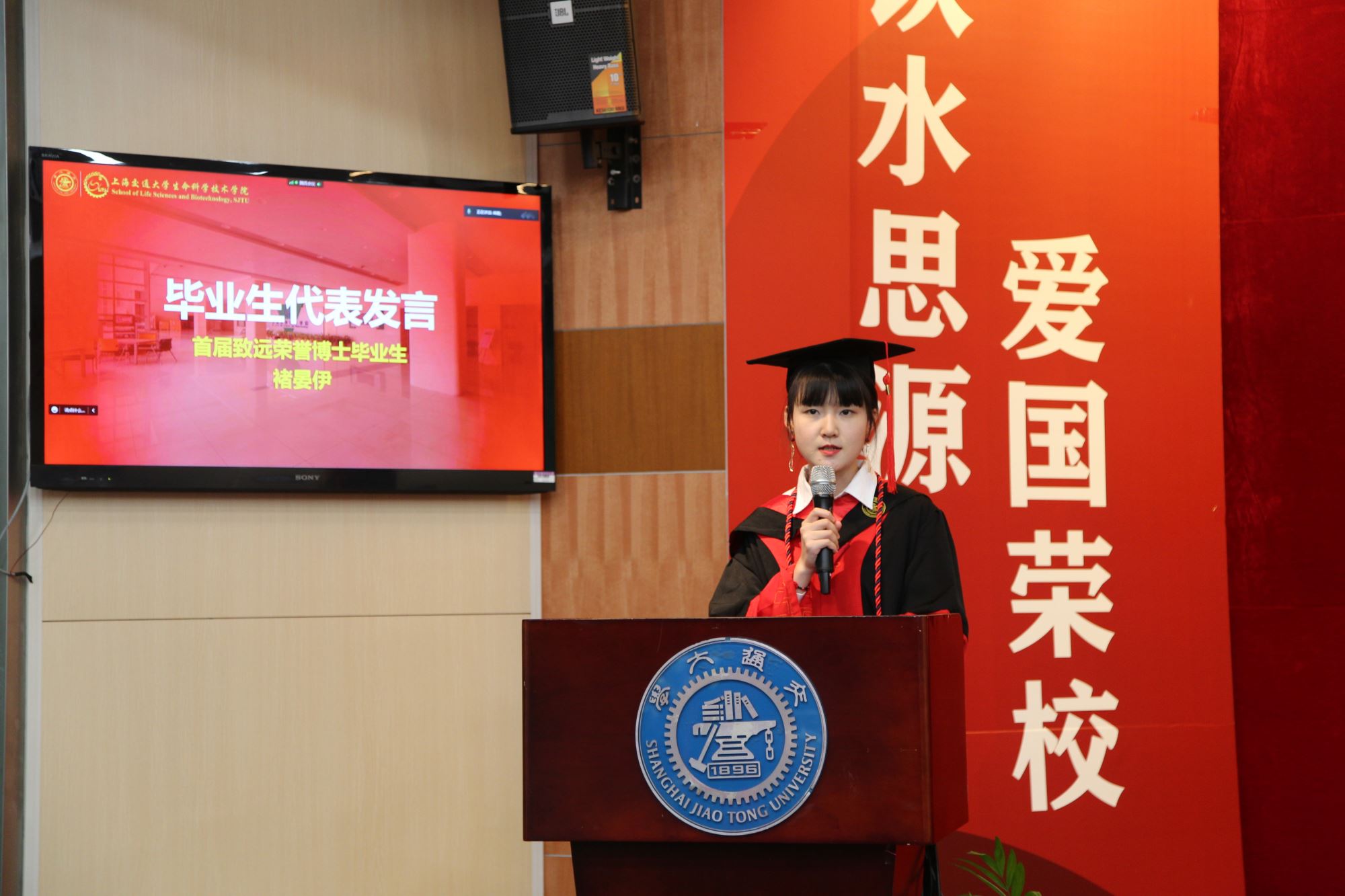 CHU Yanyi, an outstanding graduate of Shanghai, delivered a speech on behalf of the graduates. She looked back her hardworking pathway at SJTU, and emphasized the importance of insisting on pursuing one’s career. CHU said that it would be a great honor to contribute to the scientific progress of the motherland.