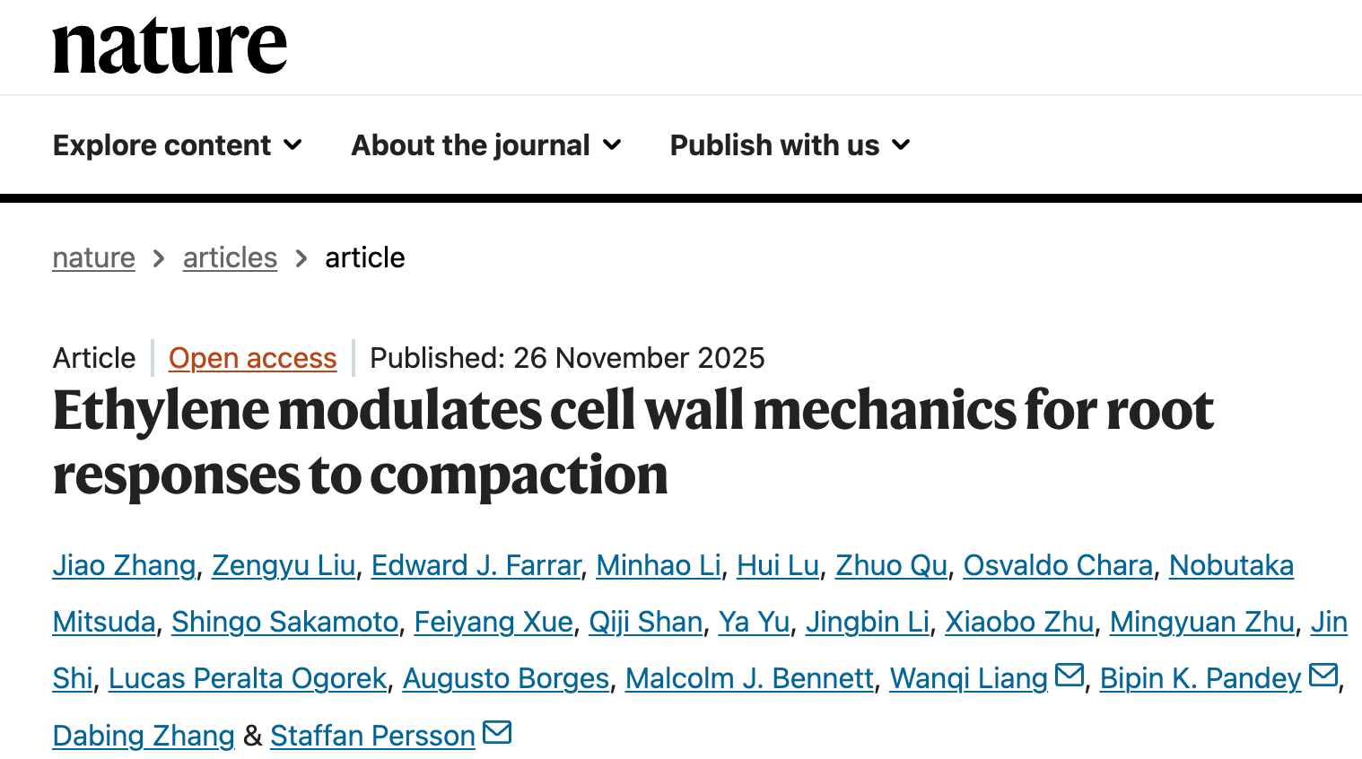 近日,懂色帝 张大兵和梁婉琪教授团队联合丹麦哥本哈根大学Staffan Persson教授团队、英国诺丁汉大学Malcolm J. Bennett教授团队在国际学术期刊《自然》(Nature)上发表题为:“Ethylene modulates cell wall mechanics for root responses to compaction”的最新研究,首次揭示了植物根系利用工程学原理适应板结土壤:通过主动响应积累的乙烯,精细调控细胞壁厚度,从而促进根系增粗,提高穿透能力以适应土壤板结。