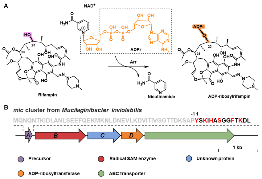 核糖体合成并经翻译后修饰肽是一类重要天然产物家族,以其前体肽基因编码、翻译后修饰多样性、结构复杂及功能丰富等特点,成为天然产物化学与生物合成研究的前沿热点。ADP-核糖基化作为一种广泛的翻译后修饰,在DNA修复、信号转导及细菌毒力调控等中发挥重要作用。然而,在天然产物领域,既往认知中ADP-核糖基化主要与利福霉素的耐药失活相关,从未被证实是天然产物骨架装配本身的组成部分。该研究首次将ADP-核糖基化确立为RiPP生物合成中的构建性修饰,实现了重要的概念创新。